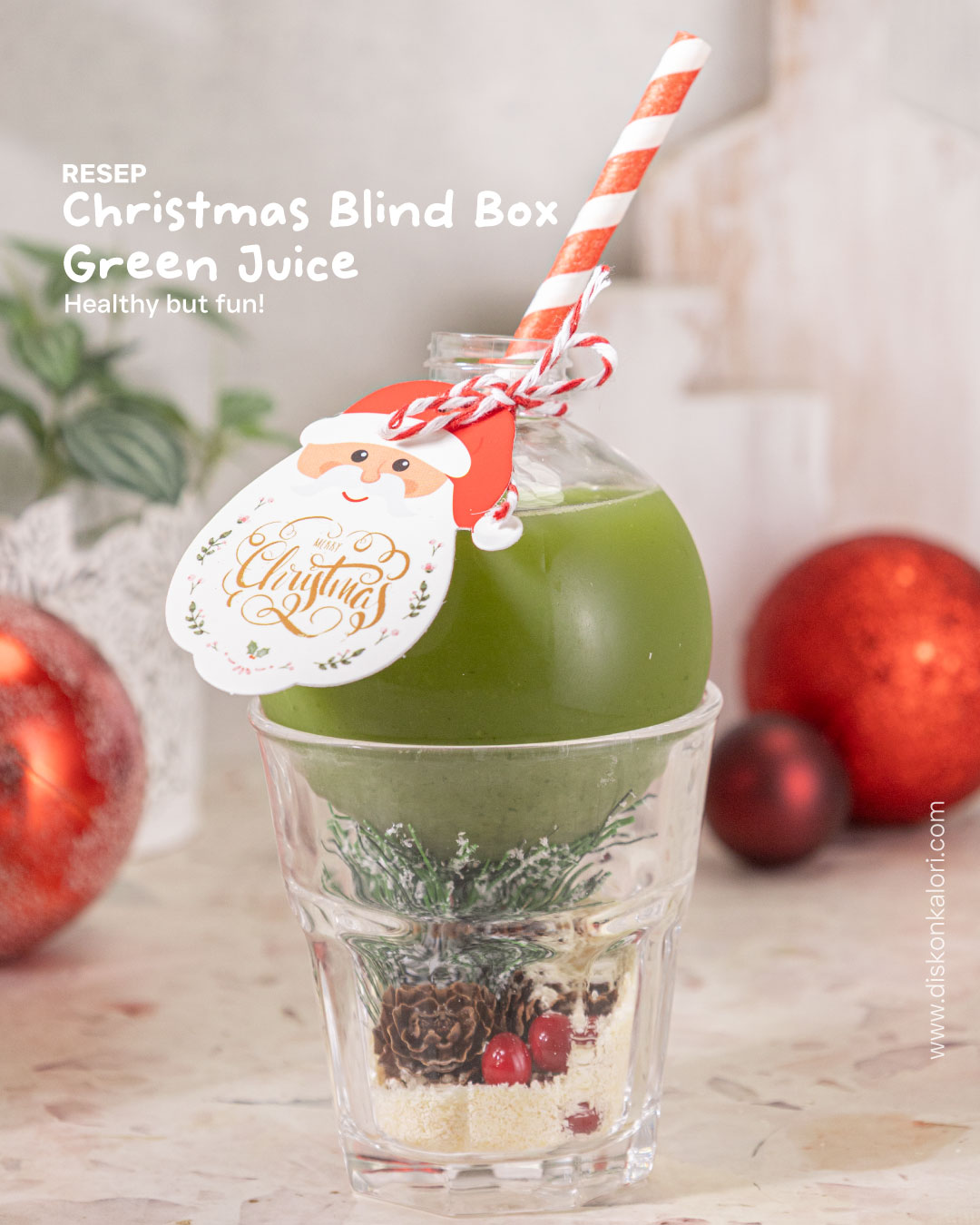 Ide minuman Natal ini terinspirasi dari konsep blind box yang selalu bikin anak-anak penasaran. Di dasar gelas, saya taruh mini Christmas charm sebagai kejutan kecil. Aturannya sederhana: jusnya harus dihabiskan dulu, baru boleh “menggali” surprise yang ada di dalam gelas. Lucu, seru, dan tanpa terasa anak-anak jadi lebih semangat minum sayur.