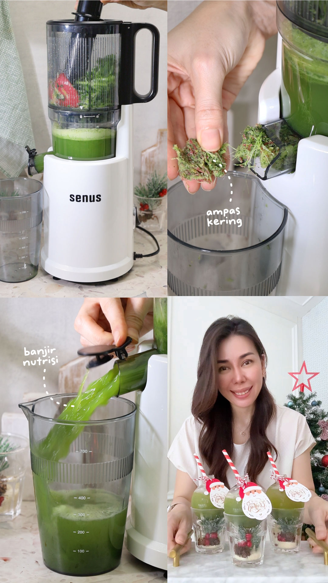Untuk membuat jus dalam jumlah banyak sekaligus, saya pakai slow juicer Senus (official store - disini) karena praktis dan kapasitasnya lega. Hopper-nya besar, jadi bahan bisa langsung dimasukkan tanpa perlu ribet potong kecil-kecil. Cocok banget dipakai saat acara Natalan di rumah, apalagi kalau bikin untuk beberapa gelas sekaligus.