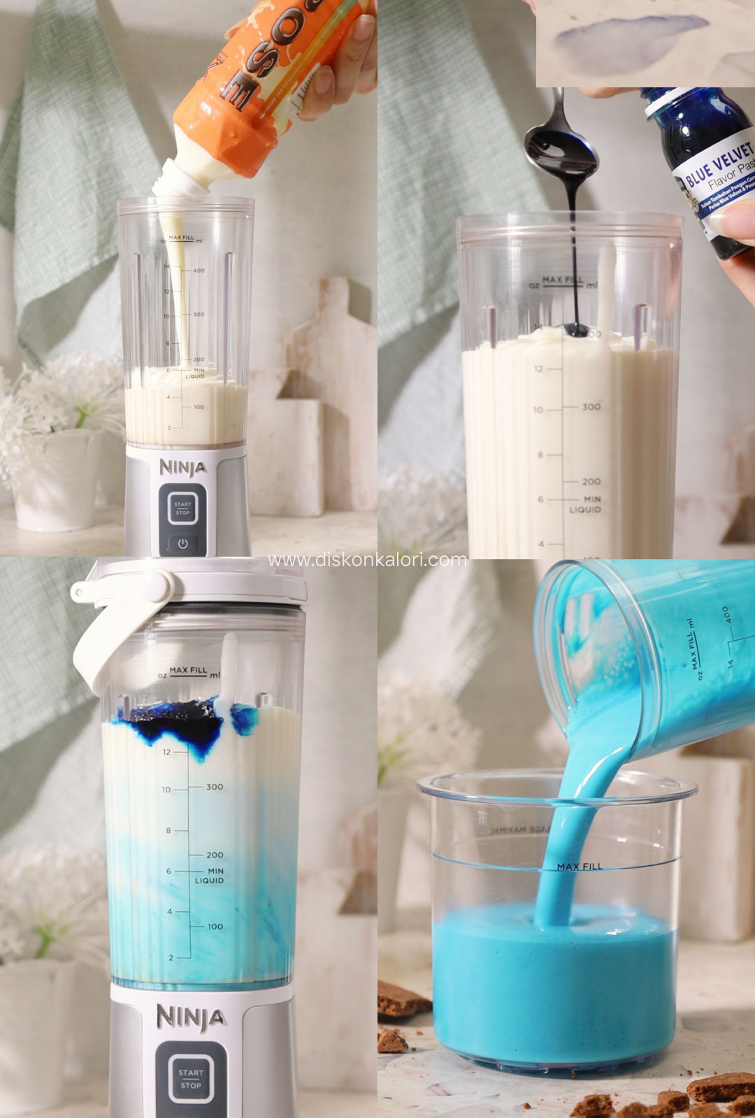 1. Campur semua bahan base – Xpose Protein, Lakanto, blue velvet, dan garam dalam mangkuk.