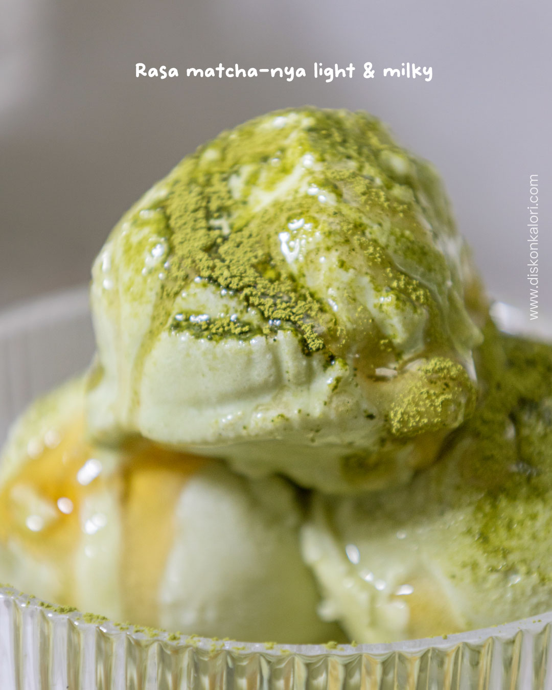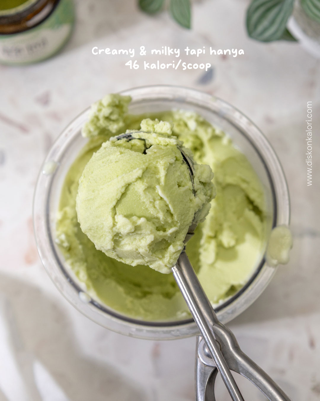 Bebas Laktosa, rendah kalori, padat nutrisi dan pastinya kadar gulanya jauh dibawah es krim matcha komersil.
