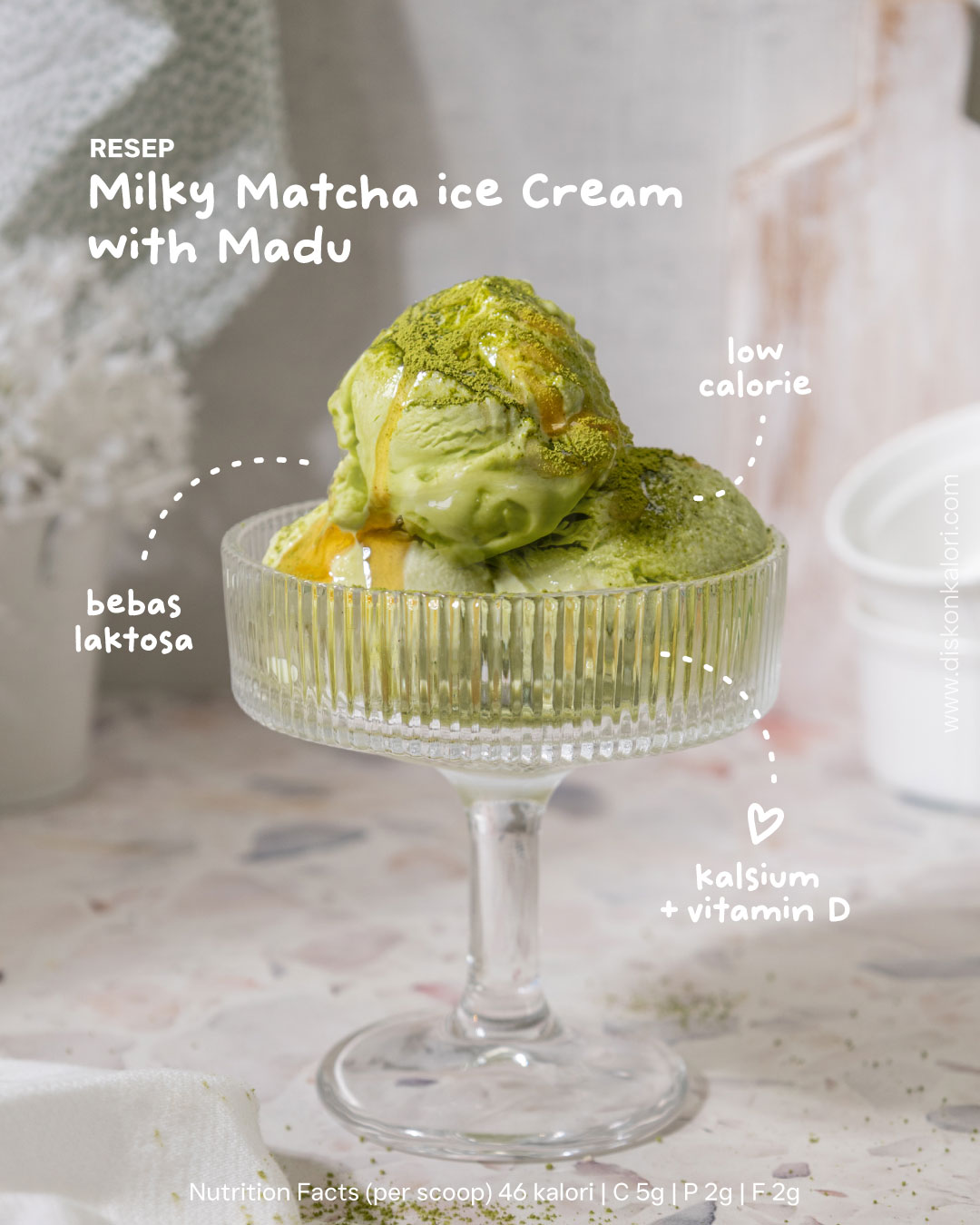 Nah, resep Milky Honey Matcha Ice Cream ini jadi solusi manisnya. Pakai susu bebas laktosa Milk Life yang tetap creamy dan bernutrisi, tapi jauh lebih ramah di pencernaan. Manisnya dari madu organik, plus rasa matcha yang seimbang. Bonusnya, per scoop cuma 46 kalori — diet aman lah! Rasa matcha-nya light, milky, dan lembut, cocok untuk yang kurang suka matcha pahit.