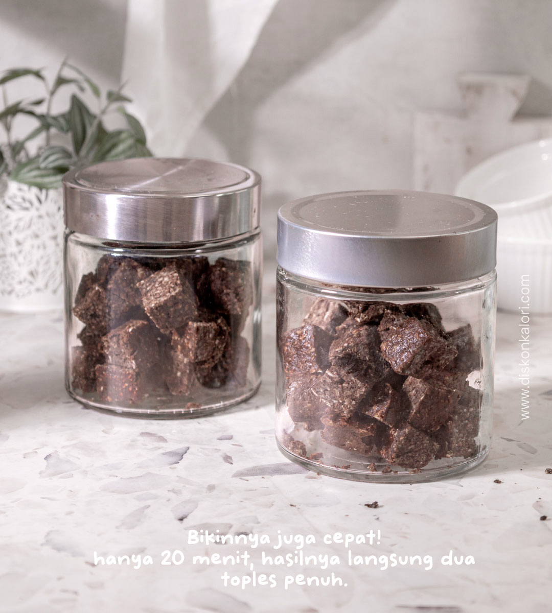 Tanpa butter, tanpa minyak, rendah lemak dan gula, tapi rasanya tetap chewy, nyoklat, legit, dan bikin puas dimakan potongan kecil-kecil. Bikinnya juga cepat: hanya 20 menit, hasilnya langsung dua toples penuh. Siapin adonan pun cuma butuh 5 menit, sisanya 15 mins airfryer. Kalau mau samaan toplesnya bisa beli disini.