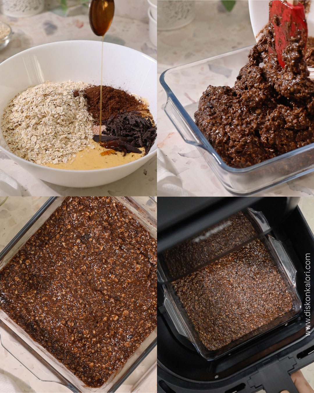 2. Masukkan oatmeal, bubuk cocoa, dark chocolate, vanilla, baking powder, dan garam. Aduk rata.