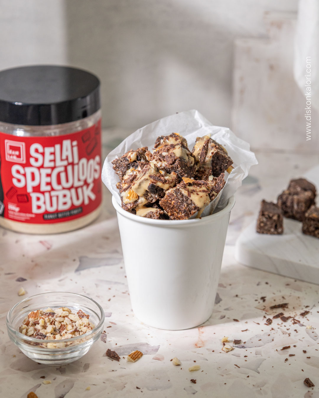 Saya pakai selai Speculoos rendah kalori dari LeanLab (klik disini untuk official store). Satu porsi cukup 6 gram aja, tinggal dicampur air langsung jadi selai kacang creamy tapi versi low cal. Kenapa bisa rendah kalori? Karena sebagian lemak dari kacangnya sudah di-remove, jadi kita dapat rasa kacang gurihnya tanpa extra kalori berlebih.