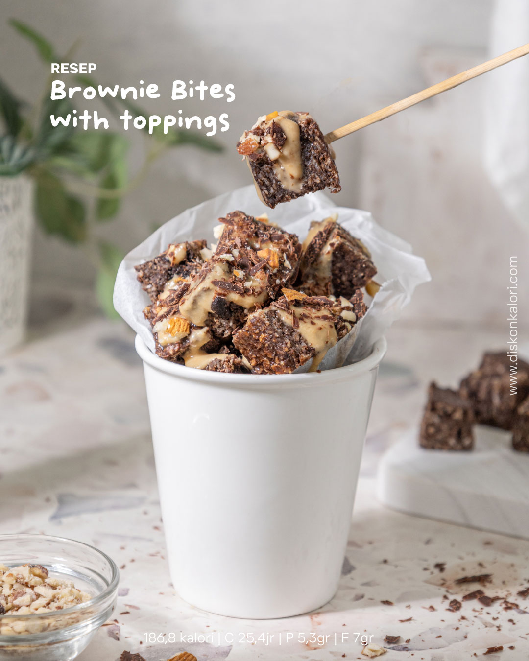 Base-nya pakai resep Brownie Bites rendah kalori, di mana 1 bites cuma 12 kalori. Satu porsi isi 10 bites aja udah bikin kenyang, karena bahannya padat nutrisi: pisang, telur, dan oatmeal. Jadi walau mini, tetep bikin puas.
