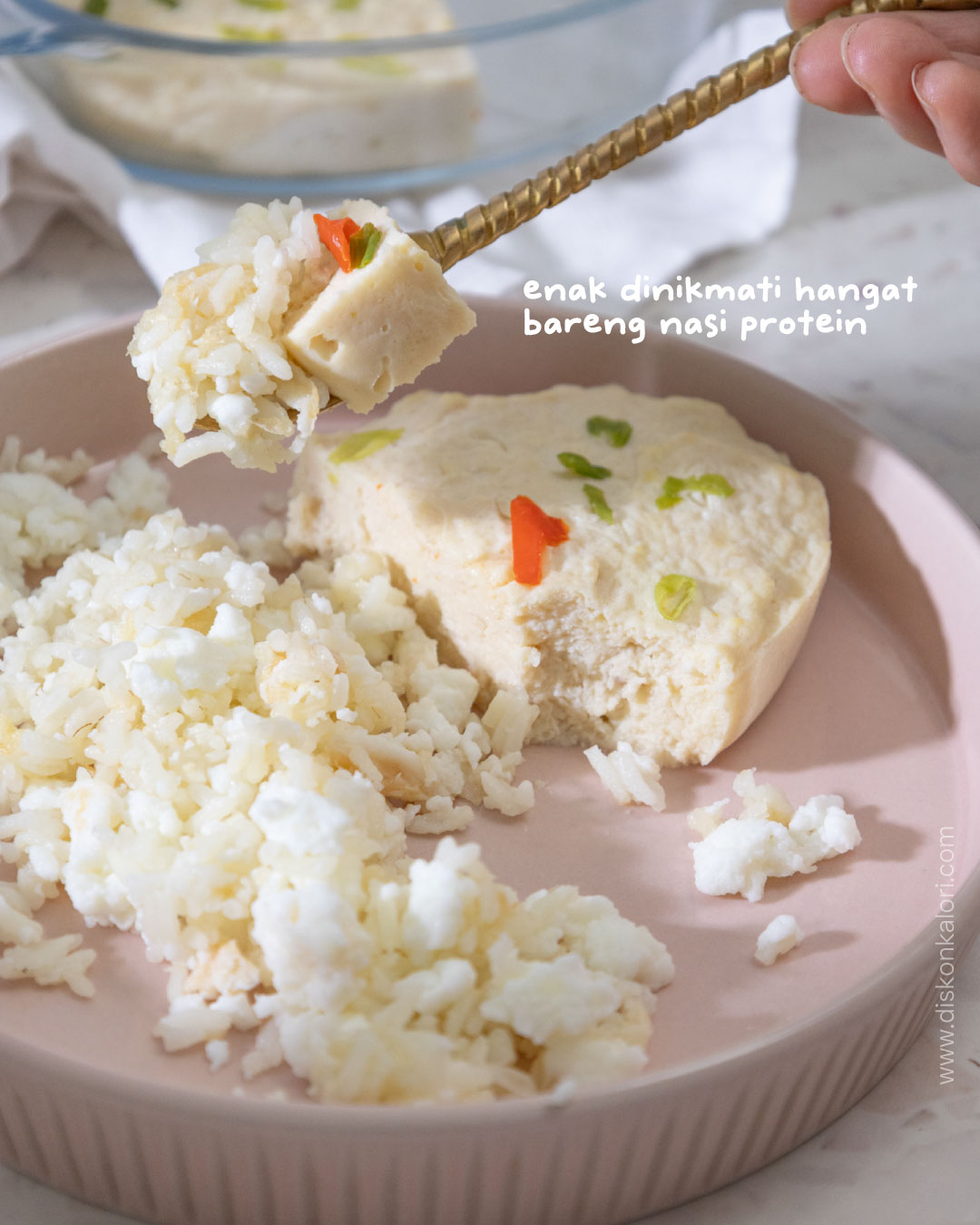 Biasanya saya menyajikannya bersama nasi protein — ini trik favorit saya untuk mengurangi kandungan karbohidrat sekaligus meningkatkan protein. Caranya simpel: masak 100 g putih telur bersama 40 g nasi putih, hasilnya tetap seperti makan nasi biasa tapi dengan protein ekstra. Supaya praktis, putih telurnya saya beli yang literan, lbh praktis dan hemat ga buang merah telur yah. Saya bisanya gunakan putel yang ini atau yang ini. Biasanya beli diantara 2 itu sih.