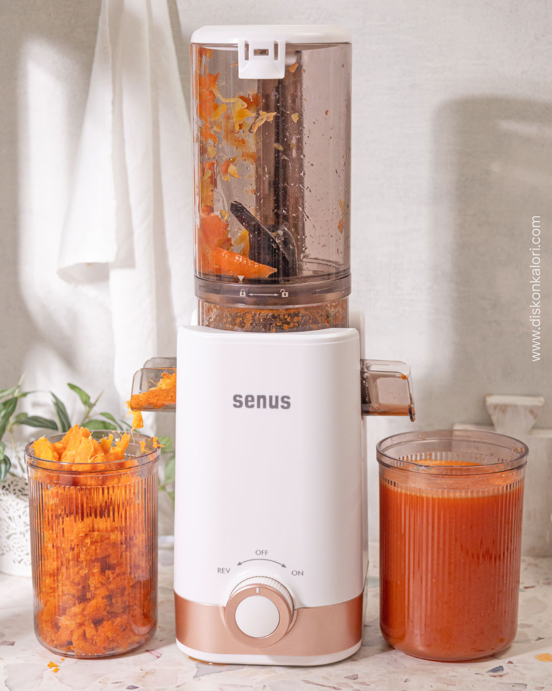 Resep ini saya buat dengan Slow Juicer Senus terbaru — slow juicer tertestetik dengan warna putih & rosegold. Desainnya slim dan compact tapi tetap powerful, daya hanya 150 watt sehingga hemat listrik dan hemat tempat. Walaupun kecil, hasil ekstraksinya maksimal: murni sari buah tanpa tambahan air, jadi jus yang dihasilkan tetap pekat, fresh, dan penuh nutrisi.