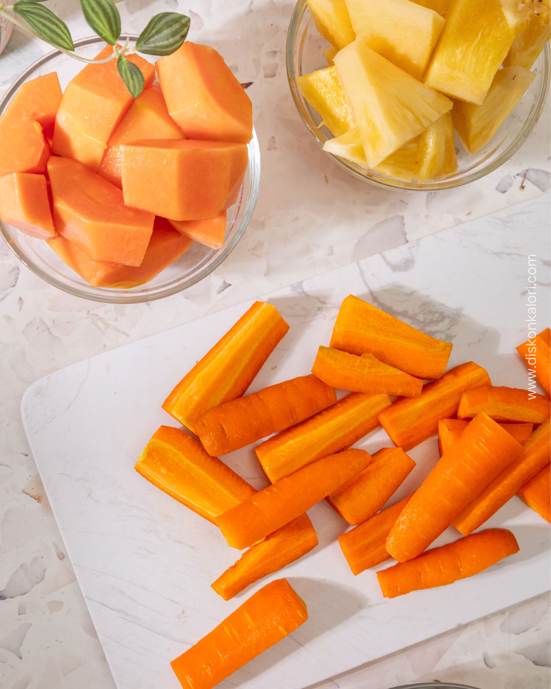 Potong semua bahan, lalu masukkan ke slow juicer secara bergantian antara buah keras (wortel) dan lembut (pepaya, nanas).